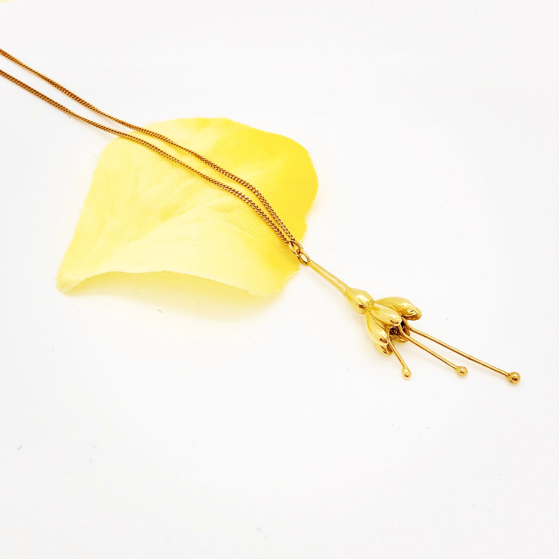 A delicate gold pendant captures the elegance of a fuchsia flower. This handmade flower is sensuous and elegant with intricate details. Long graceful stamens hang below the petals, adding a refined and sensory touch