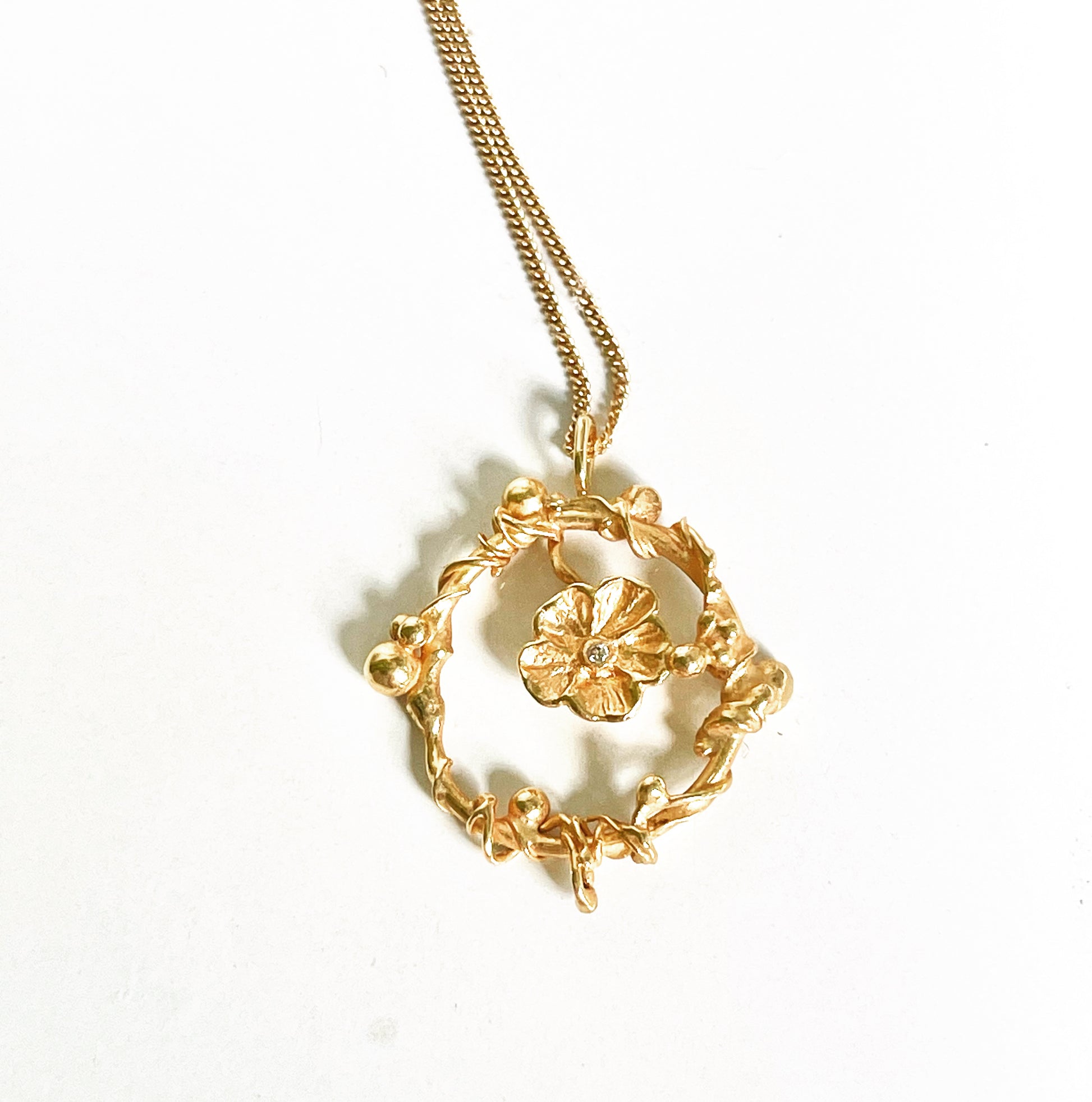 This dainty gold pendant features an organic hoop entwined with delicate tendrils and intricate granulation details, creating a refined, naturalistic charm. At the centre of this fairy tale hoop sits a small, hand-crafted flower, with petals sculpted in gold and a single, sparkling diamond at its heart that catches the light beautifully.